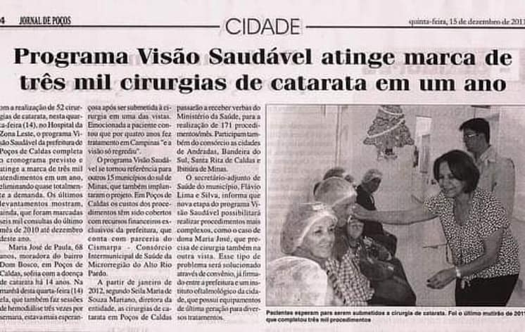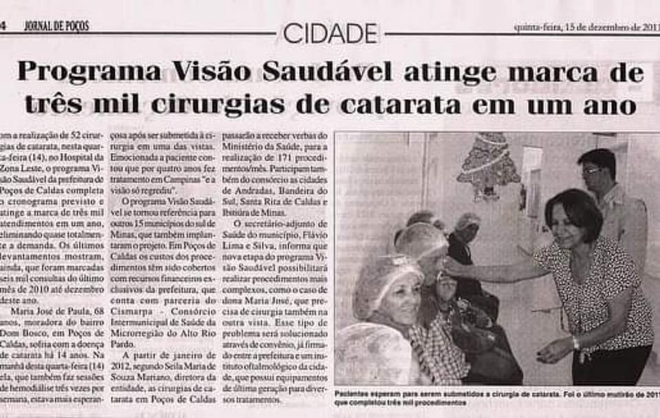 Em 2010, assumi o cargo de Secretário Adjunto de Saúde. Implantamos o Programa Visão Saudável, primeiramente no Lions e depois no Hospital da Zona Leste. Foram mais de três mil cirurgias de catarata em um ano. Começa aí uma nova forma de atender com mais agilidade nossa população e esta realização pioneira me permite dizer que “sou o pai dos mutirões” em Poços.